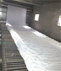 平幅練漂可對(duì)棉及其混紡、交織針織物和精細(xì)嬌嫩、高氨綸含量以及易卷邊的敏感性針織物進(jìn)行溫和濕處理,使織物在低張力下傳輸,經(jīng)過(guò)滲透、連續(xù)汽蒸、轉(zhuǎn)鼓噴淋水洗。與溢流機(jī)加工相比,消除了坯布長(zhǎng)時(shí)間與噴嘴和機(jī)件的相互摩擦,從而減少了織物在加工過(guò)程中的褶皺、磨毛等質(zhì)量問題,產(chǎn)品質(zhì)量明顯提高,是加工高技術(shù)含量高附加值產(chǎn)品的有效途徑,同時(shí)可做到節(jié)能減排、清潔生產(chǎn)。